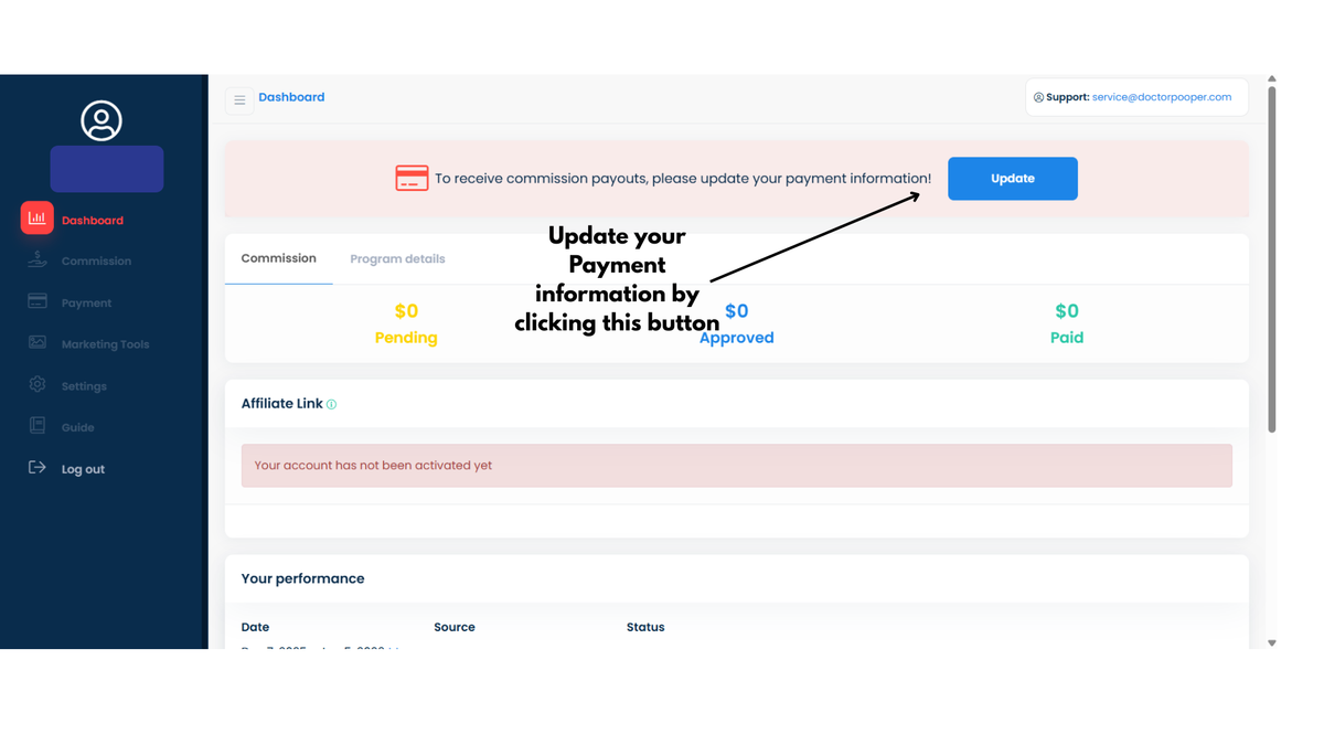 On your dashboard, Update your payment information. And you can now share your affiliate link!
